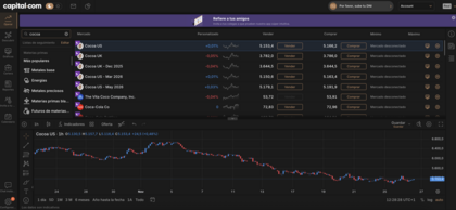 - CFDs sobre Cacao a través de plataformas como Capital.com: Te permiten especular con el precio del cacao sin poseer el activo. Con los CFDs podés ganar tanto si el precio sube (posición larga) como si baja (posición corta). El apalancamiento es el gran atractivo, pero también la principal fuente de riesgo: podés perder más de lo que invertiste.