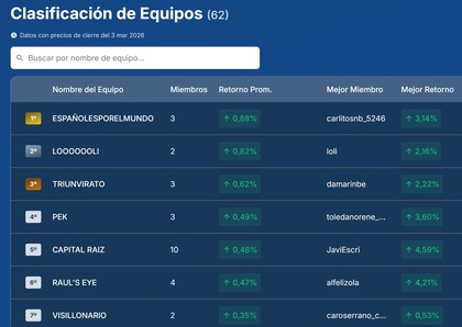 Invertir no tiene por qué ser una actividad solitaria. El Desafío permite crear Equipos donde la rentabilidad se promedia entre los miembros. Ya hay 62 grupos formados, desde grandes comunidades hasta pequeños grupos de amigos o colegas de oficina. Es la excusa perfecta para debatir tesis de inversión y aprender de los errores ajenos.