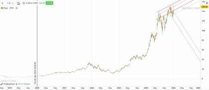 Si nos fijamos en el grafico diario para los últimos 5 años podemos ver que su precio creció exponencialmente desde el 2020, año en el que también se beneficio en medio de la pandemia con un incremento de la venta de sus tarjetas graficas para videojuegos. Las cuales posteriormente fueron el eje principal de la inteligencia artificial con el impulso de ChatGPT.