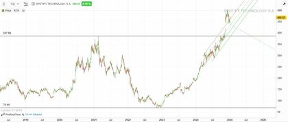 Spotify no tiene un gran historial en bolsa, ya que la firma empezó a cotizar en abril de 2018. Pero si observamos en detalle en grafico desde el 2018 a la actualidad podemos apreciar como la pandemia le permitió alcanzar un máximo histórico en los 387.89 dólares y un mínimo en los 72 dólares. En diciembre logro alcanzar los 500 dólares por acción para luego retroceder.