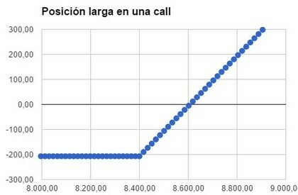En el caso de una opción call, la prima inicial es de 207 y el precio de ejercicio (strike) es de 8400.