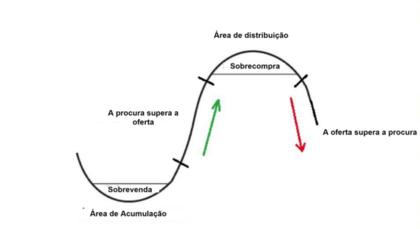 Acá, los grandes inversores descargan sus posiciones y dejan atrapados a los inversores que compran, la mayoría de las veces, porque vieron en los periódicos o en la televisión que las acciones están subiendo intensamente en la bolsa de valores. Esquema de distribución La distribución es la última fase de un ciclo, donde generalmente hay aumentos de volumen mientras el precio se mueve de manera lateral después de una gran tendencia. Los grandes inversores, con información confiable, perciben los movimientos de precios. Comienzan a deshacerse de grandes bloques de acciones.