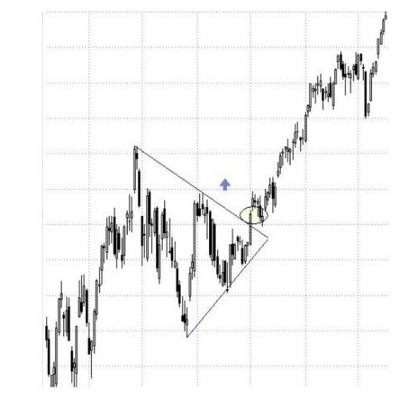Mientras el precio se encuentra dentro del triángulo, el volumen tiende a ser bajo. Sin embargo, cuando el precio rompe el triángulo hacia arriba, el volumen aumenta.