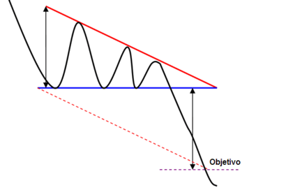 Tiene una directriz superior descendente y una directriz inferior horizontal. Este patrón sugiere una continuación de la tendencia bajista, indicando que los vendedores están en control.