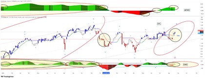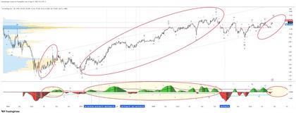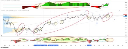 El indicador MEWO nos muestra el potencial comportamiento del ciclo en grado mayor, la continuidad de la tendencia según su desarrollo contra el eje cero y las bandas. Indicamos con elipses de contorno rojo y negro la información más relevante a considerar, donde podemos interpretar en MEWO los momentos de potencial inicio de fuerza motriz en aumento, complementando la vista en EWO mostrando grado inferior en su estructura, y sobre el gráfico de precio la instancia relevante para nuestro análisis. La conjunción permite reforzar el análisis inicial de ondas de Elliott.