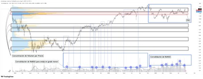 Respecto del volumen vertical, que informa la cantidad de negociaciones según la media móvil configurada, nos revela el comportamiento sobre o bajo la media, permitiendo evaluar si contamos con desarrollos incrementales, descendentes o estables según la compresión de tiempo. La interpretación de divergencias entre volumen horizontal y precio nos permitirá evaluar ondas correctivas con mayor o menor probabilidad de validación dentro del ciclo. Indicamos en celeste el período de convalidación para un potencial desarrollo de onda 4.